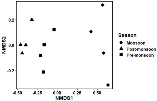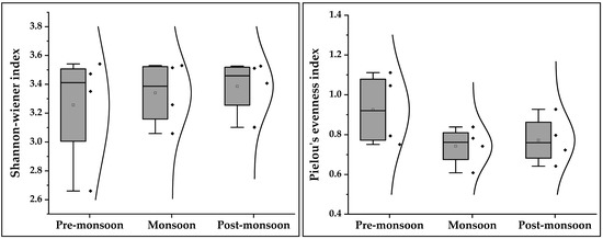 The Shannon diversity index is an estimation of diversity that integrates species richness and their relative abundances whereas species evenness is defined as how species are evenly distributed in an ecosystem. Species diversity and evenness were significantly higher in the period of the post-monsoon and lowest in the monsoon. A significant difference was visualized in the Shannon (F = 10.22, p = 0.004) and Evenness index (F = 9.915, p = 0.005) among the seasons (Figure 7 and Table S1). Tukey’s multiple comparison tests indicated insignificant differences occurred in diversity between pre-monsoon and monsoon, while significant variation appeared between pre-monsoon with post-monsoon and monsoon with post-monsoon. Significant differences in evenness index were observed between pre-monsoon vs. monsoon and monsoon vs. post-monsoon. However, the evenness index was insignificant between pre-monsoon vs. post-monsoon. The Shannon diversity (F = 10.22, p = 0.004) was significantly higher in the post-monsoon (3.51) compared to the pre-monsoon (3.25) and monsoon (2.83) period subsequently, which was more or less similar to the value (1.69–3.09) reported by Kumar and Vyas [62] from the selected reach of River Narmada, India. However, lower diversity of macro-benthos was reported by Matin et al. [14] in the Feni estuary and Sharif et al. [12] in the lower Meghna estuary. On the other hand, higher macro-benthic diversity was recorded in the different mangrove ecosystems of Tamil Nadu Coast, India by Thilagavathi et al. [63]. Magurran [64] stated that the value of H’ need to remain in the range of 2.5 to 3.5 for a healthy environment, which supports the present findings. In addition, the evenness index (F = 9.915, p = 0.005) increased with the increasing H’, and a significantly higher value was observed in the period of post-monsoon (0.92) compared to pre-monsoon (0.75) and monsoon (0.50) season respectively. Sarkar et al. [16] observed the evenness value ranged from 0.61–0.85 at Meghna and Bakkhali River estuary, which supports the present findings.