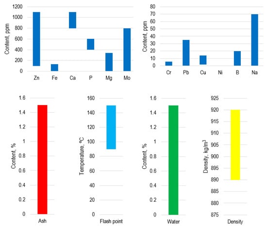 - Mitusova, T.N.; Khavkin, V.A.; Lobashova, M.M.; Gulyaeva, L.A.; Shmelkova, O.I.; Ershov, M.A.; Nikulshin, P.P.; Bobkova, M.V.; Zubo, T.A.; Titarenko, M.A. Marine Fuel (Options). Patent of Russian Federation RU 2740906 C1, 21 January 2021. [Google Scholar]