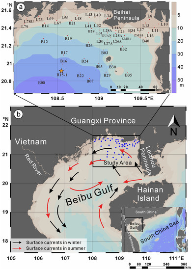 The Beibu Gulf circulation is generally counterclockwise throughout the year, and the nested sub-circulation varies in different seasons (as indicated by the black and red arrows in Figure 1b), which is cyclonic in winter and to the north but anticyclonic in summer and to the south (boundary at ~19°30′ N; [45]). In the NE BBG, circulation is co-influenced by thewestward flow through the Qiongzhou Strait and local wind fields [46,47].