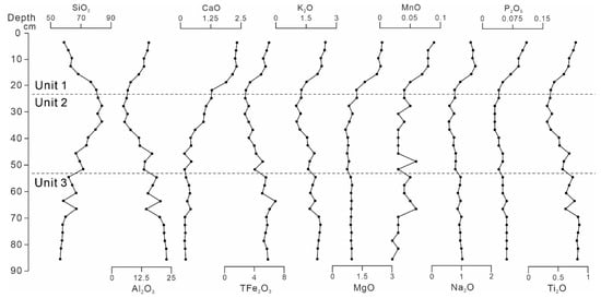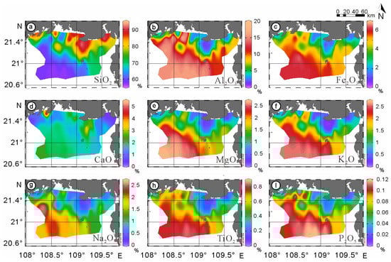 A total of 79 sediment samples (51 surface sediment and 28 core sediment samples) were analyzed for their major element contents, with the results listed in Supplementary Table S1 and their spatial distribution illustrated in Figure 4. The variation trends of the SiO2 content (surface sample: 55.7–94.6 wt%; B15-1 core sample: 56.2–84.2 wt%) and Al2O3 content (surface sample: 0.27–18.0 wt%; B15-1 core sample: 4.90–23.0 wt%) are highly variable. The contents of the other major element oxides are generally below 6 wt%, and they (except for CaO) show similar spatial and vertical variation trends with Al2O3 (Figure 4 and Figure 5).