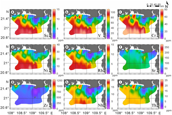 Trace element distribution maps of the study area. Concentrations of: (a) Sc; (b) V; (c) Cr; (d) Ni; (e) Rb; (f) Sr; (g) Zr; (h) Nb; (I) Th.