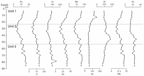 The spatial distribution patterns of many of the trace elements (including Sc, V, Cr, Ni, Rb Nb, and Th) are highly similar to those of major elements like Al2O3, i.e., they are enriched in the surface sediments with greater water depth but depleted in the coastal area with high SiO2 content (Figure 6a–e,h,I). A good correlation between the Sr and CaO concentrations can be observed (Figure 6f). A high Zr concentration only occurs in limited areas close to Zhenzhu Harbor and Tieshan Port, located in the northwestern and northeastern parts of the study area, respectively (Figure 6g). The concentrations of Sc, V, Cr, Ni, Rb, Nb, and Th from core B15-1 largely show the same trend, decreasing in Unit 1 and gradually increasing in Units 2 and 3. Zr and Sr show different distribution patterns: Sr is stable in Unit 2 and 3, increasing in Unit 1, while Zr increases downcore and reaches its maximum near the bottom of Unit 2, while decreasing in Unit 3 (Figure 7).