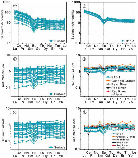 Chondrite-, upper-continental-crust (UCC)-, and Post-Archaean average Australian sedimentary rock (PAAS)-normalized REE patterns of the sediments from the northeastern BBG. The chondrite-, UCC-, and PAAS-normalized values are from Boynton (1984) [65] and Taylor and Mclennan (1985) [64], respectively. Bulk sediment (<63 μm) REE data source: Guangxi Province, Red River and Pearl River [67,68,69,70]. (a) chondrite-normalized REE patterns of surface sediments; (b) chondrite-normalized REE patterns of core sediments; (c) UCC-normalized REE patterns of surface sediments; (d) UCC-normalized REE patterns of core sediments; (e) PAAS-normalized REE patterns of surface sediments; (f) PAAS-normalized REE patterns of core sediments.