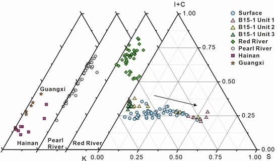 S-(I + C)-K ternary plots for argillaceous sediments from the study area and surrounding drainage basins. Data source: Pearl River and Red River from Liu et al. (2007b) [80]; Guangxi and Hainan rivers from Liu et al. (2016) [2].