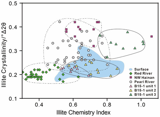 Closely related to the sediment source weathering conditions, the illite crystallinity–illite chemical index can be used to differentiate sediment provenances [7,19,81,82]. In the illite crystallinity vs. illite chemical index discrimination plot for the core B15-1 sediments (Figure 10), most of the Unit 1 and Unit 2 samples fall within the Pearl River and Red River fields, implying a mixed detrital source. Meanwhile, the Unit 3 samples have a higher illite chemical index than those from the Red River, Pearl River, and Hainan, suggesting more intensive sediment source weathering.