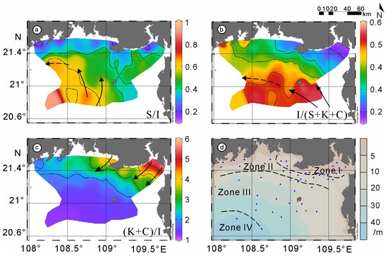 Considering the current system and fine-grained sediment transport pathways, the S/I, I/(S + K+C), and (K + C)/I ratios can reflect the regional clay mineral assemblages [84]. We considered the sediment transport direction (indicated by the black arrows in Figure 11a–c) and divided the area into four sedimentary zones (I to IV) using Q-mode cluster analysis (Figure 11d): (I) the NE BBG, with a consistently high kaolinite content and illite chemical index; (II) the coastal-offshore depositional transition, with the clay minerals derived from both the adjacent coastal and offshore regions; (III), which is the largest part of the study area, where the distribution of clay minerals and geochemical composition imply little influence of the input from Guangxi on the sediments in this zone (Figure 2, Figure 4 and Figure 6); and (IV), which only includes the B08 station (central BBG), for which the surface sediments consist of the relict deposits of the Red River pro-delta [85].