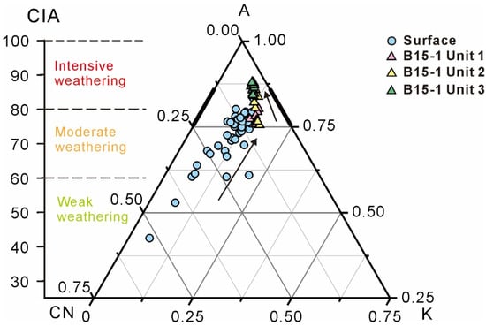 Chemical weathering would first break down calcic/sodic feldspars and release their Na and Ca, while K-feldspar (and thus the K within) would remain stable in the early weathering stage. Potassium would be leached from the source rocks under more intensive weathering [91,92]. The Al2O3-(CaO* + Na2O*)-K2O (A-CN-K) plot can be used to explore the degree of silicate weathering [93]. The surface sediments of the NE BBG are nearly parallel to the A-CN line, with few sample points under the plagioclase-orthoclase baseline (Figure 12). The core B15-1 (Unit 3) samples fall close to the Al2O3 apex, indicating that the sediments were formed under intense weathering conditions. This also suggests that the high kaolinite content was due to strong hydrolysis under intense chemical weathering, consistent with the conclusion drawn from the clay mineral compositions.
