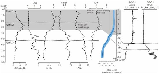 However, sediment CIA is insensitive to parent rock type. Considering the bulk Fe, Mg, Ti, and Mn contents, the index of compositional variability (ICV) is a useful proxy for compositional maturity. Rock-forming minerals, such as feldspars, hornblende, and pyroxenes, have ICV > 1, whereas alteration minerals like mica and kaolinite have ICV < 1 [63]. The ICV shows an opposite tendency to the CIA (Figure 13). The fluctuation in the ICV value around 1 indicates the contribution of both rock-forming minerals and alteration minerals in the southwestern of the study area. It is noteworthy that the ICV peak corresponds to the largest grain size, as revealed by the high SiO2/Al2O3 ratio, whereas the lowest CIA value also occurs in the middle of Unit 2. The SiO2/Al2O3 ratio can be used to infer the proportion of coarse sediments (sand-sized quartz) versus fine sediments (clay minerals) [18,94,95,96]. This correspondence of the SiO2/Al2O3 ratio with the ICV in Unit 2 suggests that more unweathered terrigenous materials, instead of alteration minerals (from hydrolysis), were transported and deposited in an active local hydrodynamic environment.