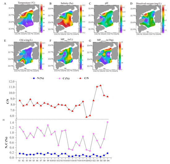 Distribution of the environmental factors and microplastic abundance in Daya Bay. (A–G) show the distributions of water temperature, salinity, pH. and Chl a and the abundance of microplastics in surface water and sediments, respectively. (H) shows the contents of N (%), C (%) and C/N at different sampling sites.