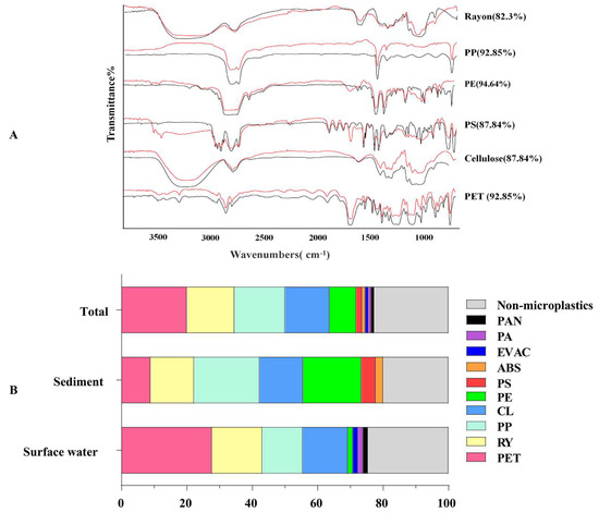 The Raman spectra of MPs show the degree of conformity to the spectra of the standards (Figure 5A). The degree of conformity of all identified MPs to the standard Raman spectra was higher than 80%, which ensured the accuracy of the identified MPs. According to the results, 89 particles were identified as MPs. Ten types of microplastics were identified, including polyethylene terephthalate (PET), rayon (RY), polypropylene (PP), cellulose (CL) and polyethylene (PE), as well as a small proportion of other components. The predominant polymer types in surface water were PET (28%) and RY (15%) and those in sediment were PP (20%) and PE (17.78%) (Figure 5B).