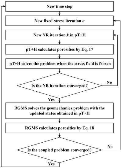 The scheme operates in a sequential manner as shown in Figure 2, where pT+H solves the problem when the stress field is frozen. The strongly nonlinear equations are solved via the NR iteration, and the porosity is calculated using