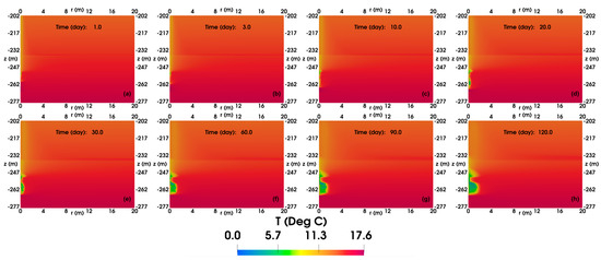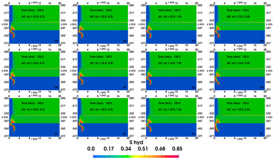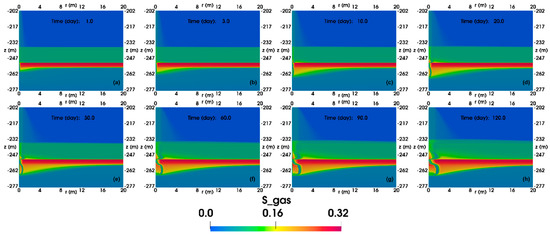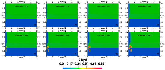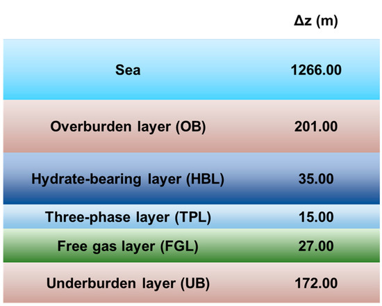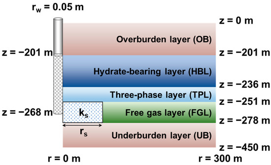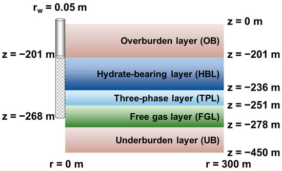 At the center of the cylindrical domain, the vertical production well was perforated from 201 mbsf to 268 mbsf, covering the HBL, the TPL, and a portion of the FGL (Figure 4). The well was treated as a pseudo-porous medium to use Darcy’s flow concepts within the wellbore, of which the properties are as follows: the vertical permeability was 5 × 10−9 m2, the porosity was 1, the capillary pressure was 0, the irreducible gas saturation was 0.005, and the relative permeabilities had linear relationships with phase saturations. This approach was able to simulate the pressure drop in a steel wellbore, which was validated in a previous study [66]. The bottomhole pressure (Pbh) was 3 MPa [67] at a gridblock above the topmost well gridblock.