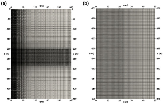 A 2D cylindrical domain with an outer radius of 300 m, as presented in Figure 4, was utilized to investigate gas production with a single vertical well. The domain was divided into 412 segments radially and 232 segments vertically, leading to 95,584 gridblocks. Gridblocks with different lengths were produced due to the high-resolution radial discretization in the vicinity of the well; specifically, the segment length in the radial direction (Δr) of 0.10 m was used for rw < r ≤ 1 m, while that of 0.20 m was used for 1 m ≤ r ≤ 21 m. For distances greater than 21 m but less than 300 m (rmax), Δr increased logarithmically for r > 0.20 m. The segment length in the vertical direction (Δz) was 0.5 m in the hydrate accumulation area and was larger in OB and UB. A mesh representation of the domain used in this study is presented in Figure 5a, while a more detailed representation of the grid near the wellbore is given in Figure 5b.