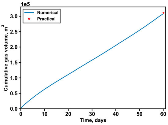 In order to guarantee the prediction accuracy of gas production at well SHSC-4, it is imperative to first validate the numerical model built earlier. As stated in the Introduction section, a trial production test was conducted at well SHSC-4, lasting 60 days, with a total gas production of 3.09 × 105 ST m3 [29]. Using the constructed model, a simulation was performed to replicate the 60-day production, taking into account the geomechanical responses. The simulation resulted in a total gas production of 3.08 × 105 ST m3, as depicted in Figure 6. This successful replication serves as validation for the constructed model.