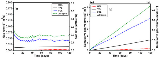 Figure 8a shows Qg produced at the well from the HBL, TPL, and FGL and all layers in the base case. The value of Qg has an initial peak after production begins, followed by a decline and minor fluctuations within a certain range in the subsequent production period. The initial peak is caused by the rapid dissociation of hydrates near the wellbore region and a subsequent surge in gas production rate after the bottomhole pressure drops. In addition, the free gas in the TPL and FGL contributes to the initial peak of Qg. The average gas production over the entire production period is 0.074 ST m3/s, which is far below the gas production rate of 0.579 ST m3/s (=5.00 × 105 ST m3/d) required for the commercial exploitation of NGHs [1]. Compared with hydrate deposits in Mount Elbert, Alaska North Slope, where there exists a lag time before substantial gas production [14], the hydrate deposit at well SHSC-4 does not exhibit such a lag phenomenon but instead has the highest gas production rate in the early stage of production, indicating that this class of hydrate deposit is conducive to exploitation. The contribution of each layer to the total gas production rate was ranked from highest to lowest as FGL, TPL, and HBL, indicating that the FGL is the primary source of gas production. This suggests that the FGL is the most important layer for gas production in the studied area.