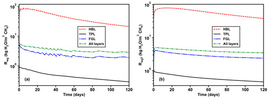 Figure 9 shows Rwg and RwgT produced at the well from the HBL, TPL, and FGL and all layers in the base case. Apart from directly evaluating production via Qg and Vg, Rwg and RwgT can also be used to indirectly characterize production performance. In real practice, more gas and less water are desired, so smaller Rwg and RwgT values are better. Rwg produced from the HBL, TPL, and FGL and all layers decreased gradually during production. Among the three layers, the HBL has the highest Rwg with the smallest contribution to gas production observed in Figure 8. Moreover, Rwg produced from the HBL is tens of times higher than those from TPL and FGL. If permeability enhancement is carried out within HBL, gas production may increase, while water production may also increase. RwgT reaches a short-term peak in the first two days of production and then shows a decreasing trend throughout the entire production period. RwgT produced from the FGL and all layers tends to stabilize in the later period of production. Due to the large RwgT produced from HBL, the total RwgT was far higher than those from TPL and FGL.