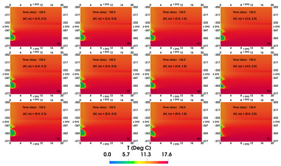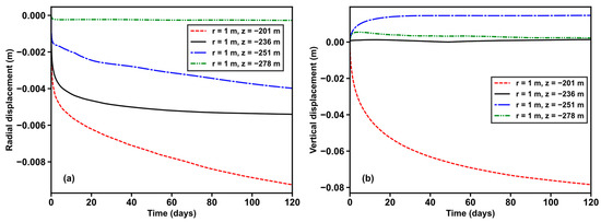 To investigate the geomechanical response during production, pT+H and the RGMS were coupled with the fixed-stress split iterative scheme so that the changes in fluid pressure, temperature, phase saturations, and associated stresses can be found. The accuracy and reliability of the scheme were verified by comparing its numerical results and the analytical solutions of Terzaghi’s problem [63] and McNamee–Gibson’s problem [64,65] in prior research [55].