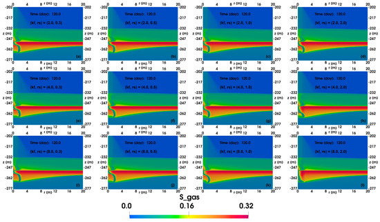 Figure 8b shows Vg produced at the well from the HBL, TPL, and FGL and all layers in the base case. As shown in the figure, in the later production period, since Qg fluctuates within a certain range, Vg, which is the integral of gas production over time, shows a nearly linear relationship with time. After 120 days of production, the FGL, TPL, and HBL accounted for 72.17%, 23.54%, and 4.29% of the total cumulative gas production, respectively. This also indicates that the FGL is the most important layer for gas production because it has the highest contribution to the total cumulative gas production. It is anticipated that the FGL will exhibit the most pronounced response to permeability enhancement.