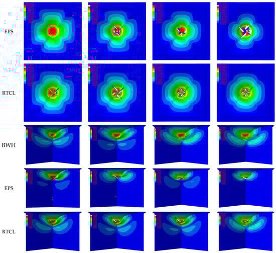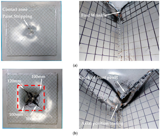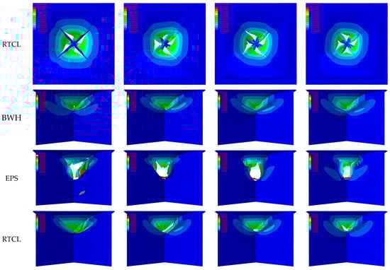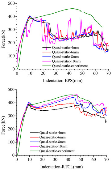 - The EPS failure criterion in the simulation in this scenario would prematurely determine the failure of the junction due to the localized compressive deformation produced by the unit. The BWH failure criterion struggles to determine the failure of the structure, and the crashworthiness of the structure evaluated by this criterion is higher than that of the actual scenario. The RTCL failure criterion is more suitable for this complex stress state crash scenario, and the tearing phenomenon of the upper panel is better simulated.