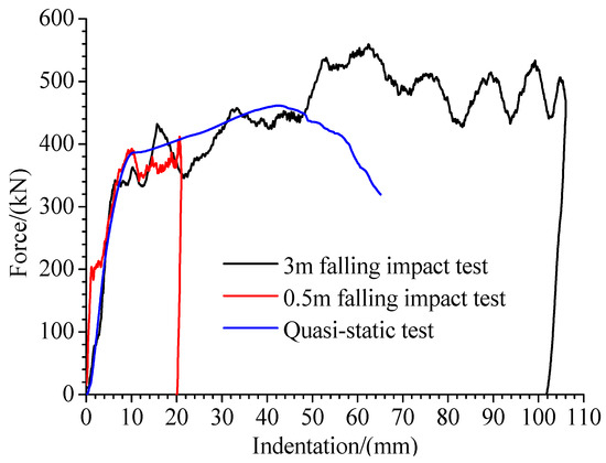 - When subjected to the impact load of a rigid indenter, the structure’s deformation range is smaller than the quasi-static load, and the deformation is relatively concentrated at the collision location. In the 3 m drop impact condition, the initial peak impact load increases by nearly 20% compared to the quasi-static collision scenario, and the average impact force increases by approximately 13% before structural failure. This indicates that the structure has a higher energy absorption capacity in the 3 m drop impact condition compared to the quasi-static collision scenario.