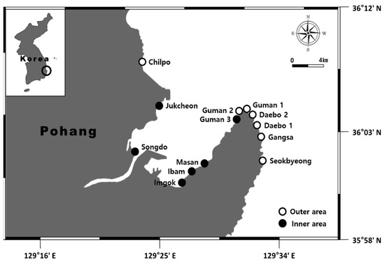 Previous studies on marine algal ecology in Yeongil Bay have been conducted by researchers [16,17,18,19,20,21], but most of them were qualitative studies. Other fields of study have been conducted on the environment and community structure of the inner area of Yeongil Bay, including research on seawater flow structure, oceanographic characteristics, and the distribution of phytoplankton [22,23,24]. These studies explained the specific characteristics of the inner area of Yeongil Bay. Despite the characteristics of the inner area of Yeongil Bay, there has been no study comparing the outer and inner areas of the marine algal community structure. The marine algal community may change due to nutrients and pollution [6,12] caused by human activities and continuous development, which can be a way to check the marine environment. In addition, it can be used as basic data to monitor the change process of the marine ecosystem for intertidal zone restoration.