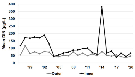 Mean value of DIN (μg/g) in the outer and inner areas of Yeongil Bay from 1997 to 2021.