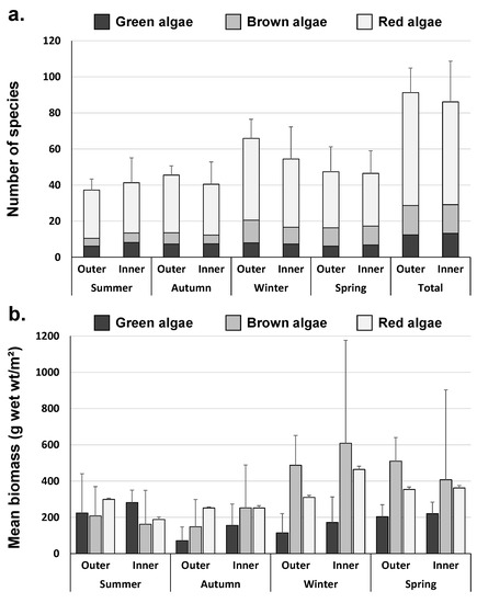 Seasonal number of species and mean biomass in the outer and inner area of Yeongil Bay. (a) number of species and (b) mean biomass (g wet wt/m2). Error bars show S.D.