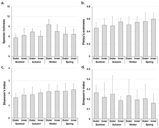 Ecological indices of marine algae flora on the outer and inner areas according to the mean value of study sites (±SD). (a) Species richness; (b) Pielou’s evenness; (c) Shannon’s index; (d) Simpson’s index.