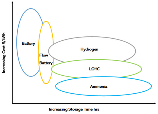 A comparison of the cost, and storage time, of ammonia with other promising energy storage technologies. Adapted the from US Government [24].
