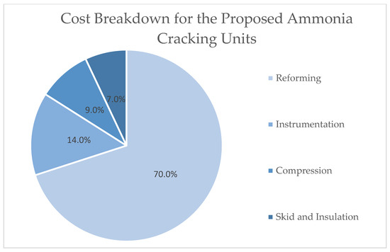 The PEM fuel cell can only be powered by hydrogen. Therefore, ammonia must be converted into hydrogen. It is anticipated that Air Products will make the largest-ever investment of US$500 million in the United States to build, own, and operate its largest-ever hydrogen production from ammonia [25]. According to a study published by the UK government [26], four dominant companies developed and evaluated a large-scale ammonia plant capable of generating fuel-cell grade purity hydrogen at large scales. With an overall efficiency of around 69%, their large-scale ammonia cracking unit can deliver high-purity hydrogen at 250 bars with a specific energy consumption of 12.65 MJ/Nm3. Figure 2 shows the breakdown of energy consumption for cracking ammonia units of kJ/mol of hydrogen produced [26]. Based on the estimated daily fuel consumption of the fuel cell module in the following chapter, this reforming unit would need to be sized to 1800 kg per day, since the estimated daily fuel consumption is approximately 1650 kg. In summary, this study concludes that ammonia as fuel and PEM fuel cells are the most promising options for the case study vessel.