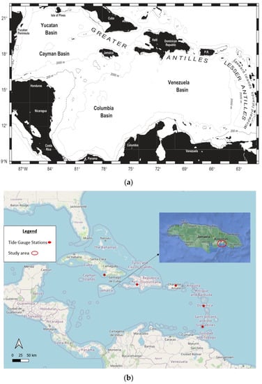 Jamaica is located at 18.11° N, 77.30° W in the northwestern Caribbean. The study area surrounding Kingston and Portmore is on the southeast coast of Jamaica. While there is significant evidence of past uplift in Jamaica (especially on the north coast, which is closer to the edge of the Caribbean plate [38,39,40]); the vertical land motion in Jamaica is on the order of less than 1 m/ka over the last 4000 years and, as such, is considered insignificant when considering sea level variability [23,41].