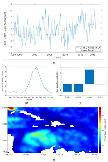 (a) Sea level trend in the Caribbean basin (mm/year). (b) Sea level anomalies 1993–2019 (mm). (c) Annual cycle of sea level anomalies, for Kingston, Jamaica. Anomalies with respect to 1993–2019 baseline. (d) Seasonal variation with respect to the annual cycle mean (mm). (e) Seasonal sea level variability (annual cycle amplitude, cm).