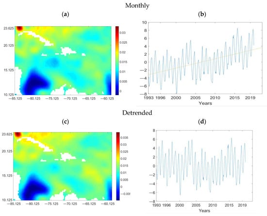 Spatial variability (Left column) and timeseries of principal components (Right column) of the leading EOF of summer (June–September) sea levels in the Caribbean for raw (a,b) and detrended (c,d) altimetry data. Period of analysis is 1993–2019.