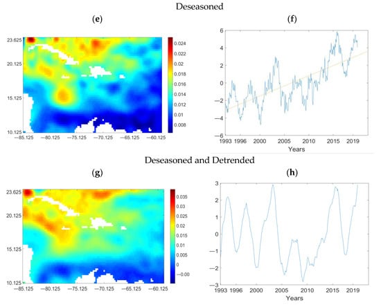 Spatial variability (Left column) and timeseries of principal components (Right column) of the leading EOF of sea levels in the Caribbean for raw (a,b), detrended (c,d), deseasoned (e,f), and detrended and deseasoned (g,h) altimetry data, spanning 1993–2019.