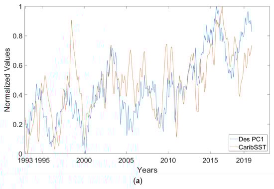 The largest significant correlations for PC1_raw are with north Atlantic SST indices (Table 4a). These include +0.46 with Carib SST, +0.38 with the AMO, and −0.55 with the Pac–Atl gradient index, which includes north tropical Atlantic SSTs in its calculation. Sea level pressure in the vicinity of Jamaica also has a significant correlation (−0.4), and there are smaller significant correlations with the NINO3 (+0.22) and NINO3.4 (+0.25) regions. The north Atlantic SST associations likely derive from long term decadal trends which are common to both timeseries. SSTs in the tropical north Atlantic become much warmer after 1995 [68,69], with the linear rise evident across all seasons, ranging from 0.1 °C/decade in spring to 0.2 °C/decade in winter and summer [69]. Warm Caribbean SSTs also associate with lower sea level pressures [70], and El Niño events influence the warm SST peaks observed in the trend [69,71]. Caribbean SSTs seemingly play a significant role in regional sea level variability, especially in the long term. The steric response of the surface layers of the Caribbean Sea to changes in atmospheric heat fluxes has been highlighted as a major reason for variability in sea levels by [20]. This suggests that continued ocean warming because of climate change will result in increasing sea levels in the Caribbean.