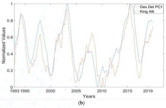 (a) PC1_deseasoned and Caribbean Sea Surface temperature anomalies (Corr = 0.65), (b) PC1_des_det and Deseasoned + Detrended Kingston altimetry data (Corr = 0.86).