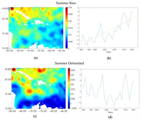 The EOF analyses were repeated for the summer season, when sea levels are at a maximum, using data for June through September. The monthly data were extracted and averaged annually, and EOFs were calculated before and after detrending. Figure 5 shows the PC1 spatial loadings and timeseries for the raw (SumPC1_raw) and detrended (SumPC1_detrended) summer data. Table 4b shows the correlations between the summer PC1 timeseries (raw and detrended) and the 10 indices. The summer season coincides with an intensification of the CLLJ [55], an eastward expansion of the Atlantic part of the western hemisphere warm pool [70], and a July intensification of sea level pressure [54]. These phenomena have a known seasonal influence on Caribbean summer climate, e.g., modulating the mid-summer drought [33,75,76]. Their association with an enhanced or diminished amplitude of the sea level summer maximum was examined.