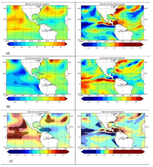Finally, composite analysis was performed to examine the extent to which surface wind variability and SSTs act as potential drivers of sea level change in the region and, specifically, for the south coast of Jamaica. The analysis was restricted to the summer season. To derive the composites, the summer (averaged over JJAS) sea level anomalies timeseries for Jamaica was divided into quartiles, and high (upper quartile) and low (bottom quartile) sea level years isolated. Composite maps of mean summer SST and near surface wind anomalies were created for the high versus low sea level years, as well as for the difference between high and low sea level years. A Student’s t-test with confidence interval 0.95 was used to determine regions of statistically significant difference [65,66].