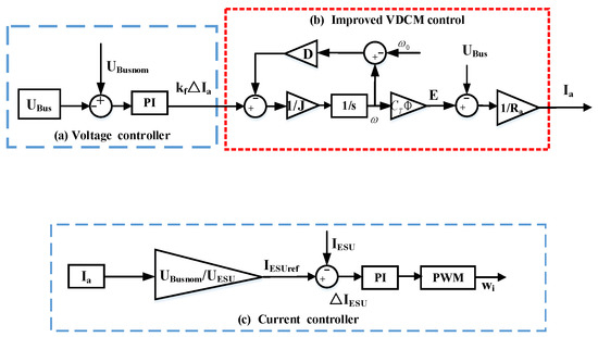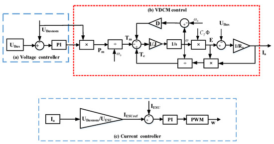 In order to enhance the inertia and damping characteristics of the DC microgrid and improve the stability of the bus voltage, the VDCM control is added on the basis of the double closed-loop constant voltage control. In Figure 2, the actual value of the bus voltage and the normal value of the bus voltage are compared in the voltage controller, and the voltage PI controller is also used to generate mechanical power Pm while keeping the bus voltage stable. Therefore, mechanical power Pm is UBusnom (kp + ki/s)(UBus − UBusnom). According to the mechanical rotation equation of the DC machine and the balance equation of the armature circuit electromotive force, the inertia and damping characteristics of the DC machine can be simulated by VDCM control. Therefore, the dynamic characteristics of the DC bus voltage can be improved. Based on the power balance principle, in current control, the armature current is converted to the ESU reference current through the UBusnom/UESU module, and the ESU reference current is used to track the ESU current. The desired control signal is finally obtained through a current PI controller and a PWM modulation.