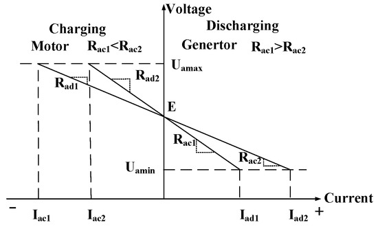 SOC balance control is actually used to find a principle of energy allocation. The ESU with high energy releases more energy than the ESU with low energy in the discharge state, or the ESU with high energy absorbs less energy than the ESU with low energy in the charge state. Eventually, the SOCs of all ESUs are consistent. However, the inherent droop characteristic of the generator and motor is an excellent energy allocation principle. Therefore, the droop characteristic can be used to change the relationship between voltage and current to achieve the control purpose. According to the droop relationship of the generator and motor, the droop characteristic lines can be obtained as shown in Figure 4.