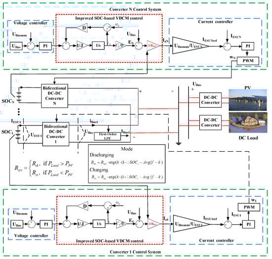 There are two working modes of ESUs, i.e., discharging mode and charging mode. The working mode is determined by PV power and load power. If the PV power is less than the load power, then the working mode of ESUs is in the discharge state. The external characteristics of DC-DC converters connected to ESUs are presented as a VDG, and the improved SOC-based VDG virtual armature resistance is Rdi. If the PV power is more than the load power, then the working mode is in the charge state. Meanwhile, the external characteristics of DC-DC converters connected to ESUs are presented as a VDM, and the improved SOC-based VDM virtual armature resistance is Rci. The control block diagram for SOC balancing with the improved SOC-based VDCM is shown in Figure 5.