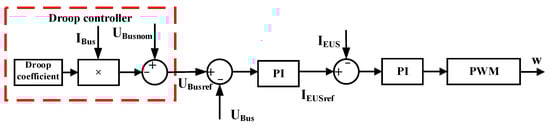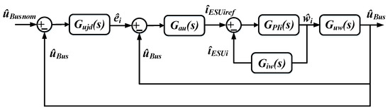 Combining (1)–(6), the control block diagram of the VDCM with the ESU is given in Figure 2b. The double closed-loop constant voltage control of a bidirectional DC-DC converter is used in the ESU interface, and the control block diagram is shown in Figure 2a,c. The stability of the DC bus voltage can be maintained through the adjustment of the outer loop of the DC bus voltage and the inner loop of the current, where UBusnom is the normal value voltage of the bus, IESUref is the reference current of ESU, and w is the duty ratio.