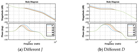 In order to analyze the influence of J and D on the proposed control, different J and D are set respectively to judge the stability and anti-interference ability of the control system. Bode plots for different J and D with fixed SOC (SOC = 80%) are shown in Figure 7. The system parameters are shown in Table 2.