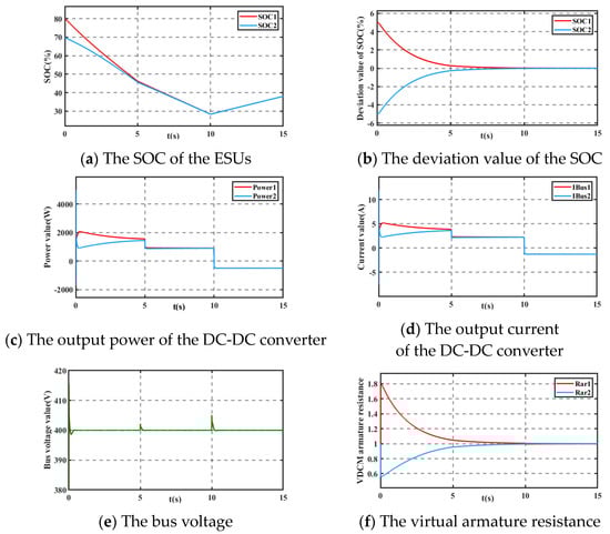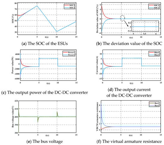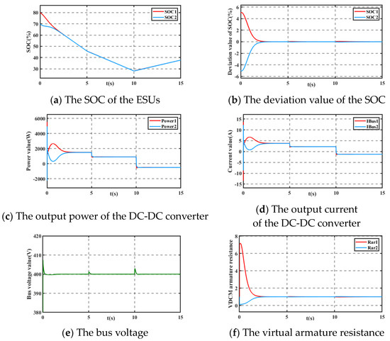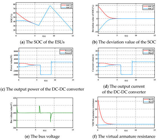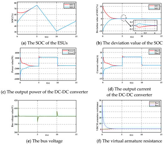 The proposed SOC-based VDCM virtual armature resistance in this paper expands the value range of virtual armature resistance, which makes the SOC-based VDCM virtual armature resistance more sensitive to SOC changes. Therefore, from Figure 14, we can see that under the same working conditions, the proposed control in this paper achieves SOC balance state within the shortest time. Combined with Figure 13, even if the value range of the virtual armature resistance increases, the dynamic effect of the bus voltage is still excellent. The results show the effectiveness and superiority of the proposed control in this paper.