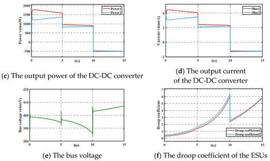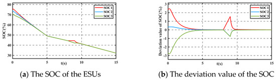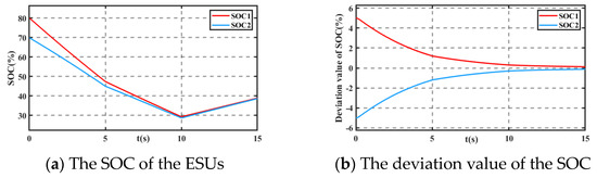 From 0 s to 6 s, the working mode of the ESUs is in the discharge state. At 6 s, the 36.57% load is removed, and the state of the ESUs changes from discharge to charge. At 9 s, the 76.47% load is added, and the state of the ESUs changes from charge to discharge. Here, we consider relatively large load variations to verify the performance of the proposed control method, which may be rare in reality. The initial SOCs of the two ESUs are 61% and 43%. The disturbance referred to in this part is a change of load.