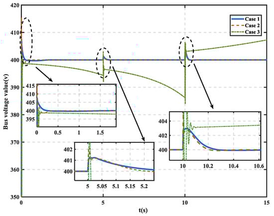 From Figure 13, we can find that although the bus voltages of the three cases are all within the allowable range, the bus voltage cannot be maintained at a normal value in Case 3. This is because only droop control is used in Case 3, and there is a deviation between the actual bus voltage and the bus voltage normal value. In comparison, the bus voltages of Case 1 and Case 2 can be maintained at the normal value without additional secondary voltage restoration control. From Figure 13, when the load changes, the bus voltage fluctuation in Case 1 is smaller than in Case 2 and the process of the bus voltage returning to a normal value is gentler. Hence, it can be proven that the improved VDCM control without a power loop and torque loop and with adaptive J and D in this paper has better a dynamic effect in suppressing bus voltage fluctuation.