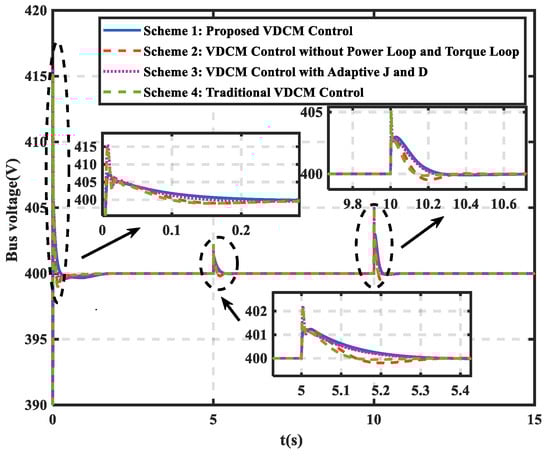 In this part, we will compare the traditional VDCM control in [24], the VDCM control with adaptive J and D in this paper, the VDCM without a power loop and a torque loop, and the proposed VDCM control in this paper on the dynamic characteristic effect of the DC bus voltage. The experimental conditions of all schemes are the same as Case 1.