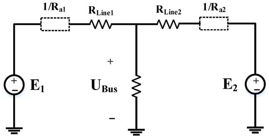 An equivalent microgrid with two ESUs is shown in Figure 17. In fact, the essence of armature resistance is actually virtual resistance. Then, the total impedance on the actual transmission line is the sum of the armature resistance and the line impedance. The armature electromotive force E in (2) is introduced into VDCM control. The armature electromotive force E can adjust adaptively to an appropriate voltage value according to the line impedance and armature resistance value. The voltage value of the supply side will not be reduced due to the existence of line impedance, so the bus voltage will not drop. Therefore, the influence of line impedance can be ignored by using the scheme proposed in this paper. Next, we will set up two simulation cases to verify the above conclusions.