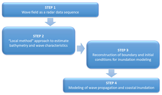 The present work describes a methodology, sketched in Figure 1, that can be successfully applied in a real-world environment. It is worth stressing that this study is based on numerical tests, where the wave field is simulated through baseline numerical simulations, hereafter referred to as large-scale tests. The initial step (STEP 1) involves the incoming wave field as a specific data sequence, which consists of temporal 2D spatial radar images generated using an ad hoc radar data simulator. Afterward, a specific algorithm is used to reconstruct the bathymetry and the sea wave characteristics from the radar data sequence up to about 3–5 m depth (STEP 2). Such information is then used to produce boundary and initial conditions for the inundation modeling (STEP 3). The final phase consists of smaller-scale numerical modeling (small-scale tests) with bathymetry and wave input from the previous step, with the final purpose of evaluating the inundated coastal area (STEP 4). The final output is validated here using both baseline (large-scale) simulations and inundation (small-scale) simulations, to ensure the suitability of the proposed approach.