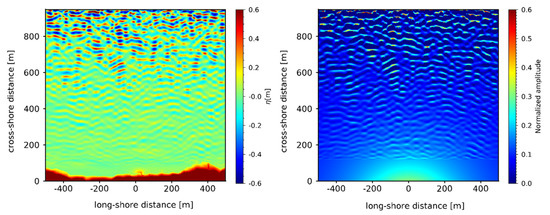 This section presents the results obtained from the elaboration of the radar data sequence by means of the “Local Method” (see Section 2.1). The numerical baseline data were used for the reconstruction of both bathymetry and wave characteristics. Specifically, each considered dataset consists of 200 individual (synthetic) snapshots of wave surface, simulating the same number of radar images, with a time interval s (see Section 3.1) and a pixel size of 2 m in the Cartesian grid. It is worth noting that the radar images were simulated by considering the antenna located at m and m, with an elevation m.
